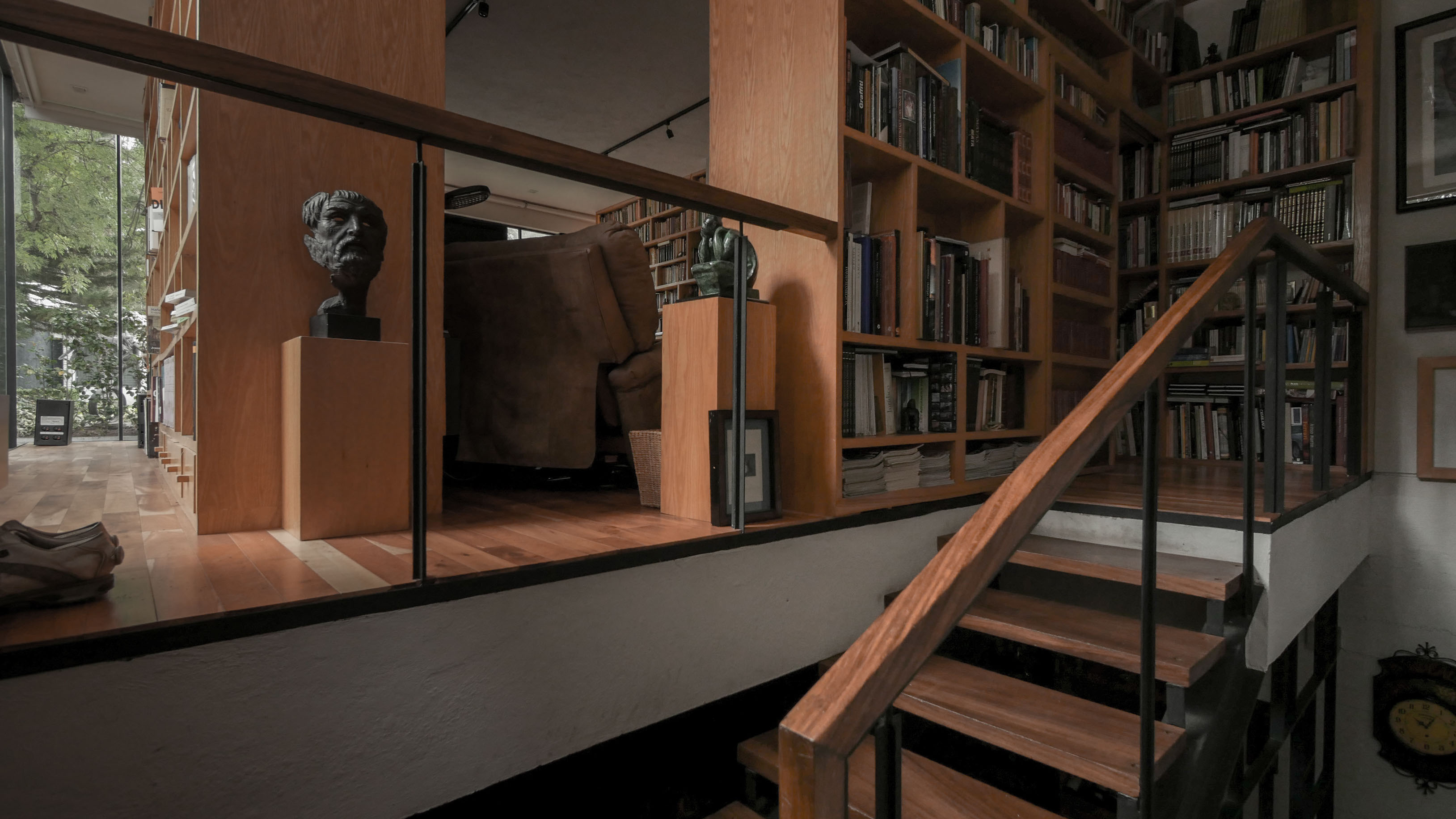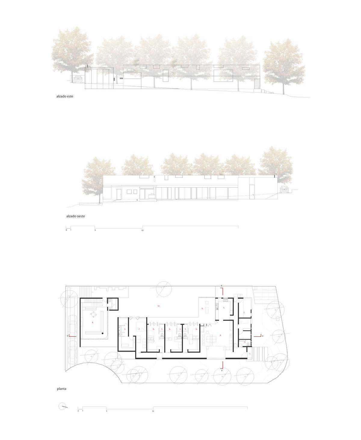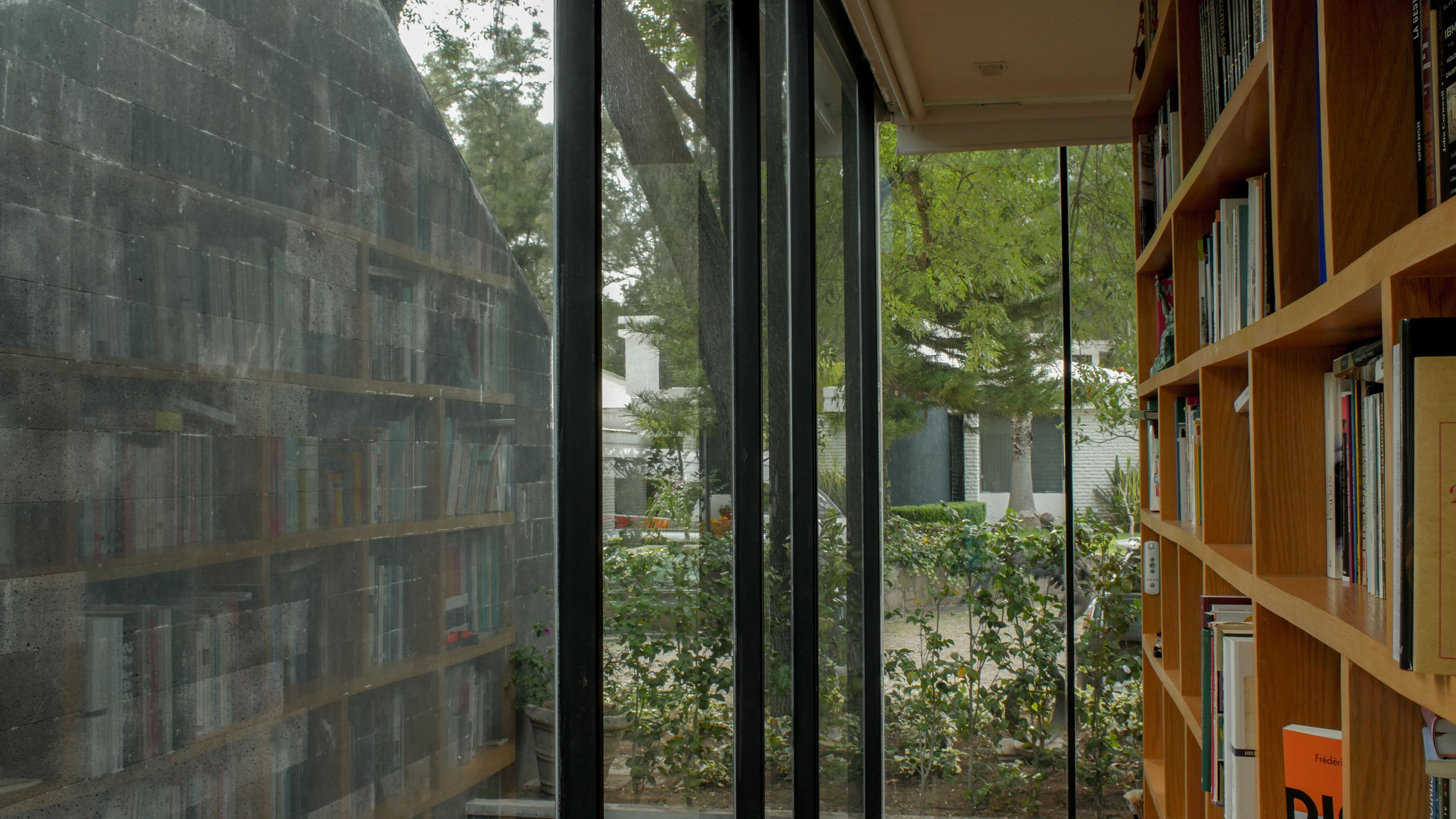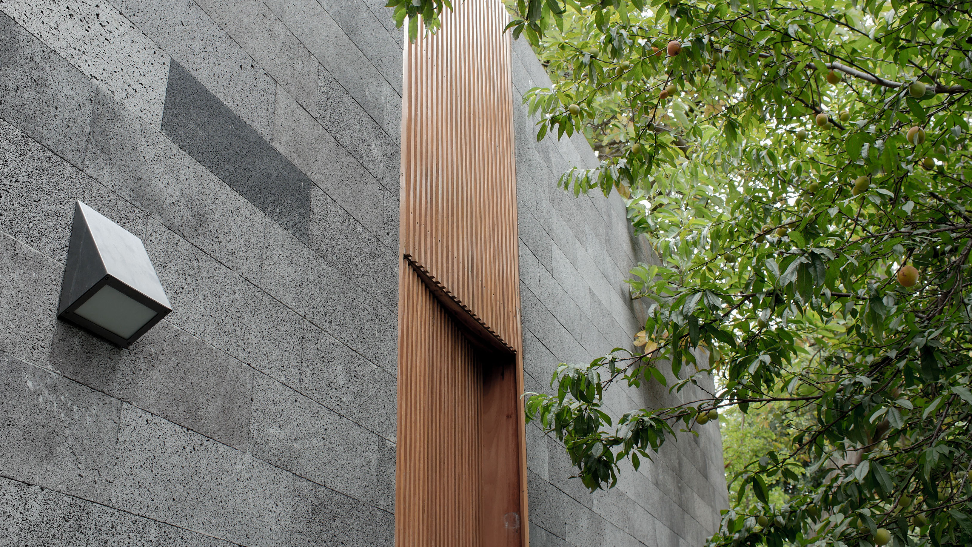 En un terreno rodeado de doce fresnos, el proyecto surge del juego entre las posibilidades de relación con los árboles y una organización programática relativamente sencilla. El edificio se emplaza en forma de “L” sobre el terreno, y a partir de ella se levanta un muro que al plegarse cubre al proyecto de roca volcánica negra, que se perfora para permitir la entrada de luz filtrada por las copas de los árboles. Por una parte, en el exterior este muro genera una fachada poco permeable, mientras que el interior del proyecto se abre totalmente hacia el jardín. El contrapunto del proyecto, una biblioteca y cava, rematan el conjunto con una geometría distinta, donde el lenguaje se invierte, y las fachadas son totalmente transparentes, aquí el libro se convierte en el verdadero resguardo entre el interior y el exterior.