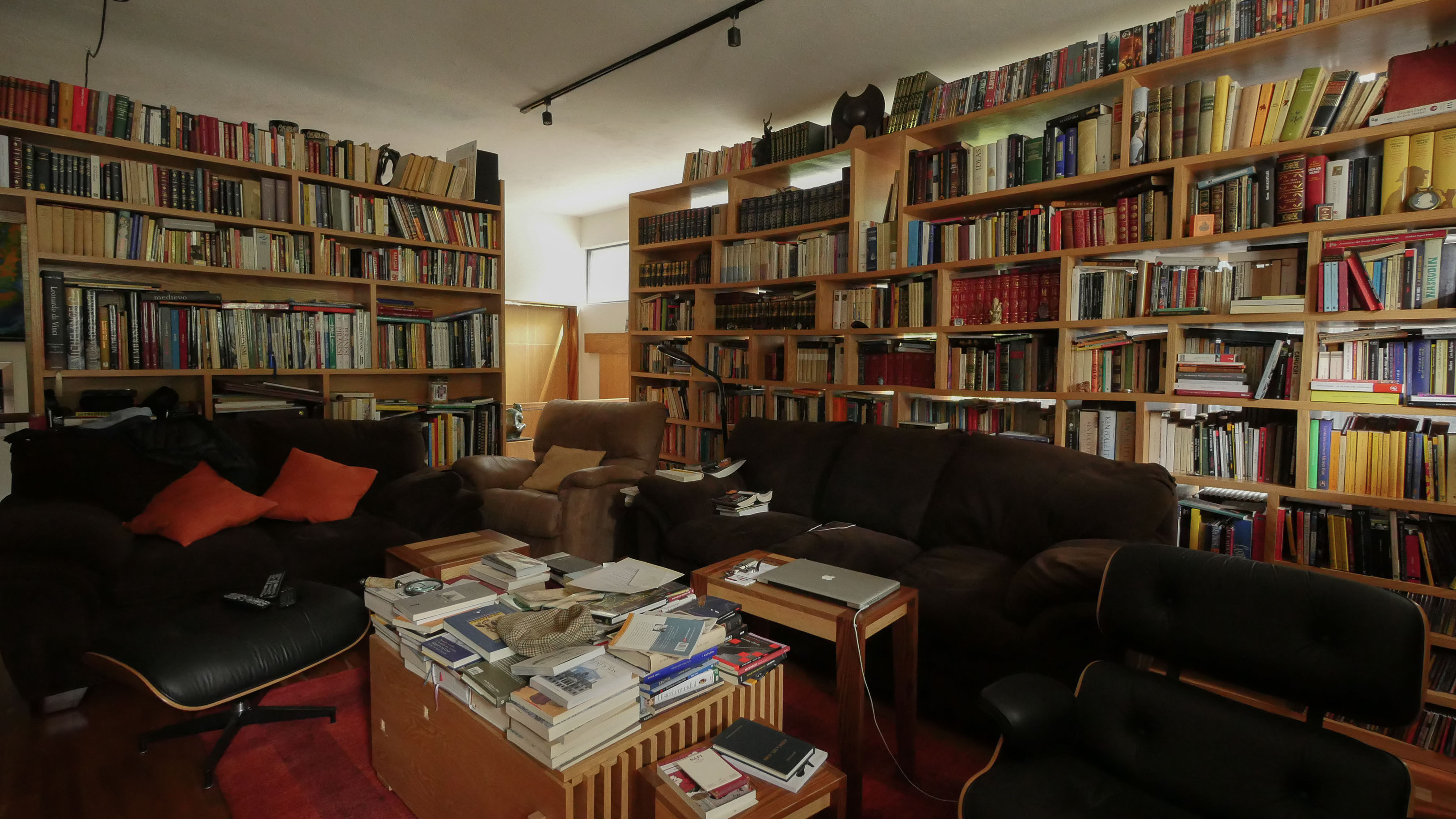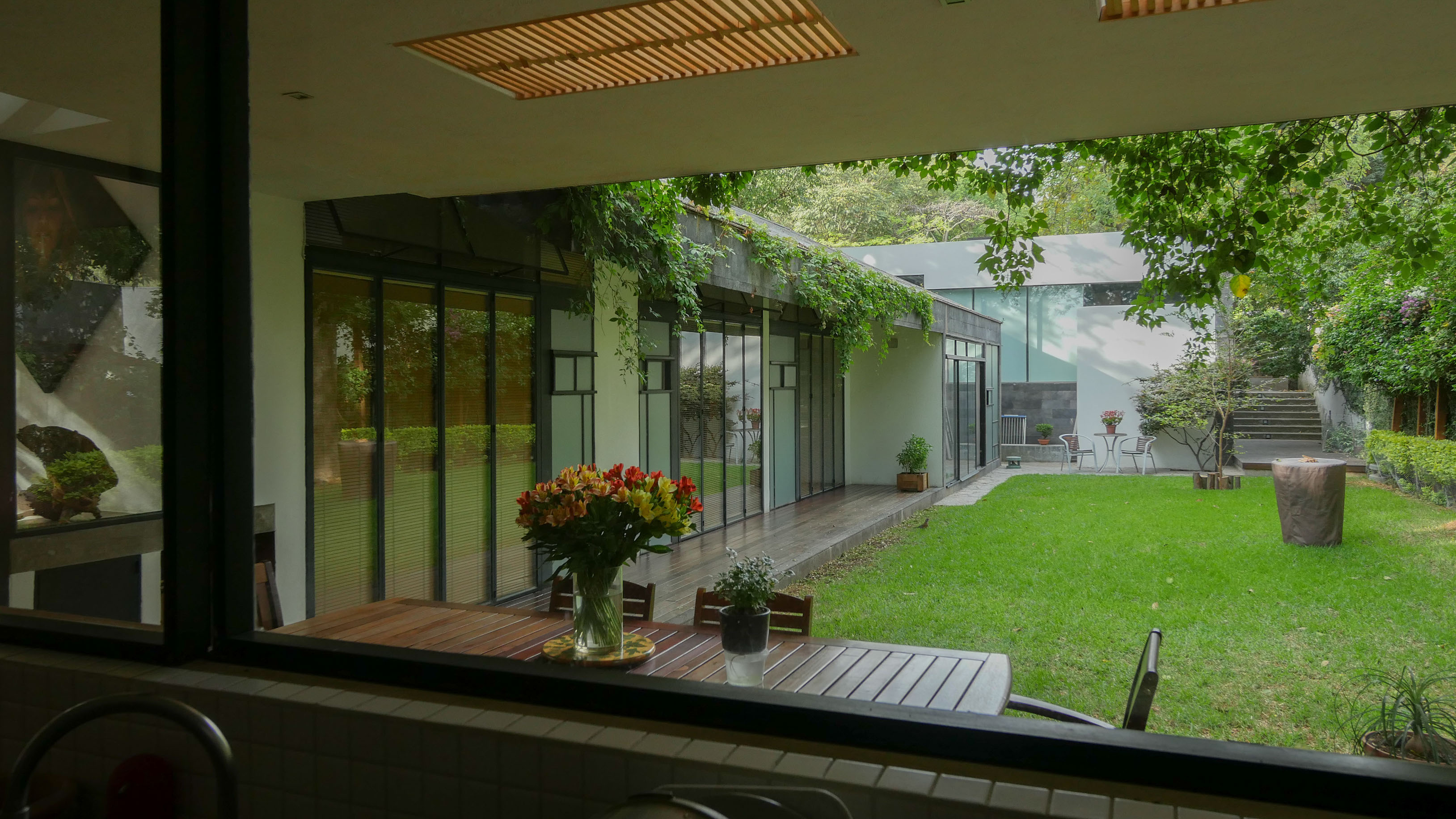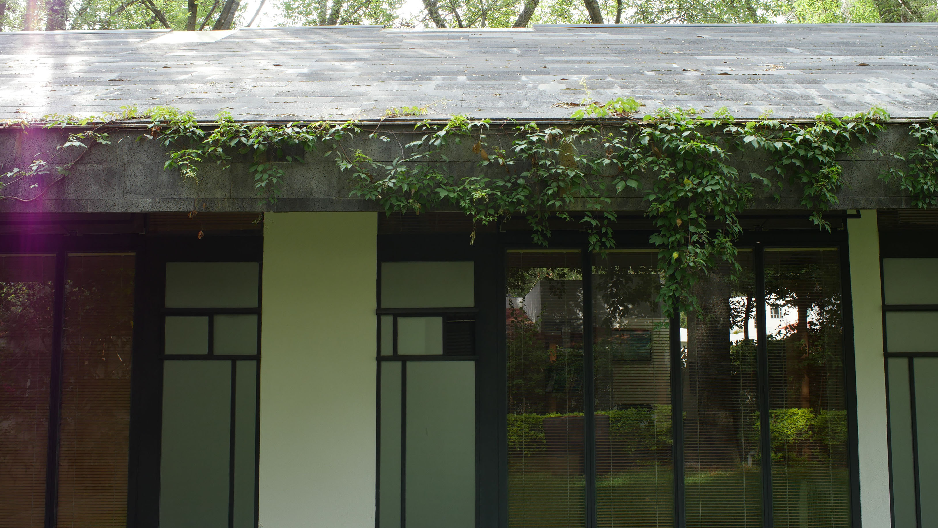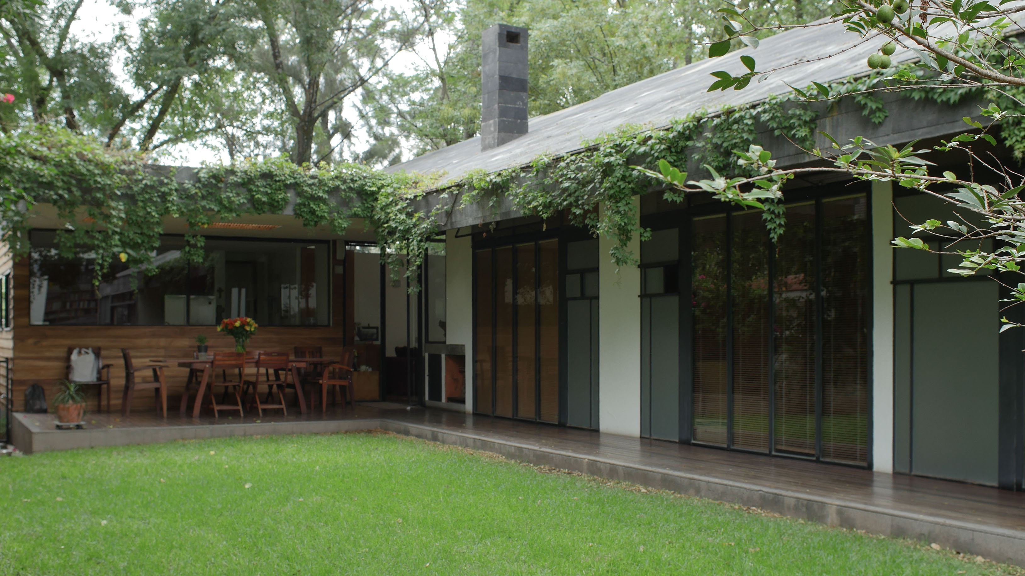 En un terreno rodeado de doce fresnos, el proyecto surge del juego entre las posibilidades de relación con los árboles y una organización programática relativamente sencilla. El edificio se emplaza en forma de “L” sobre el terreno, y a partir de ella se levanta un muro que al plegarse cubre al proyecto de roca volcánica negra, que se perfora para permitir la entrada de luz filtrada por las copas de los árboles. Por una parte, en el exterior este muro genera una fachada poco permeable, mientras que el interior del proyecto se abre totalmente hacia el jardín. El contrapunto del proyecto, una biblioteca y cava, rematan el conjunto con una geometría distinta, donde el lenguaje se invierte, y las fachadas son totalmente transparentes, aquí el libro se convierte en el verdadero resguardo entre el interior y el exterior.