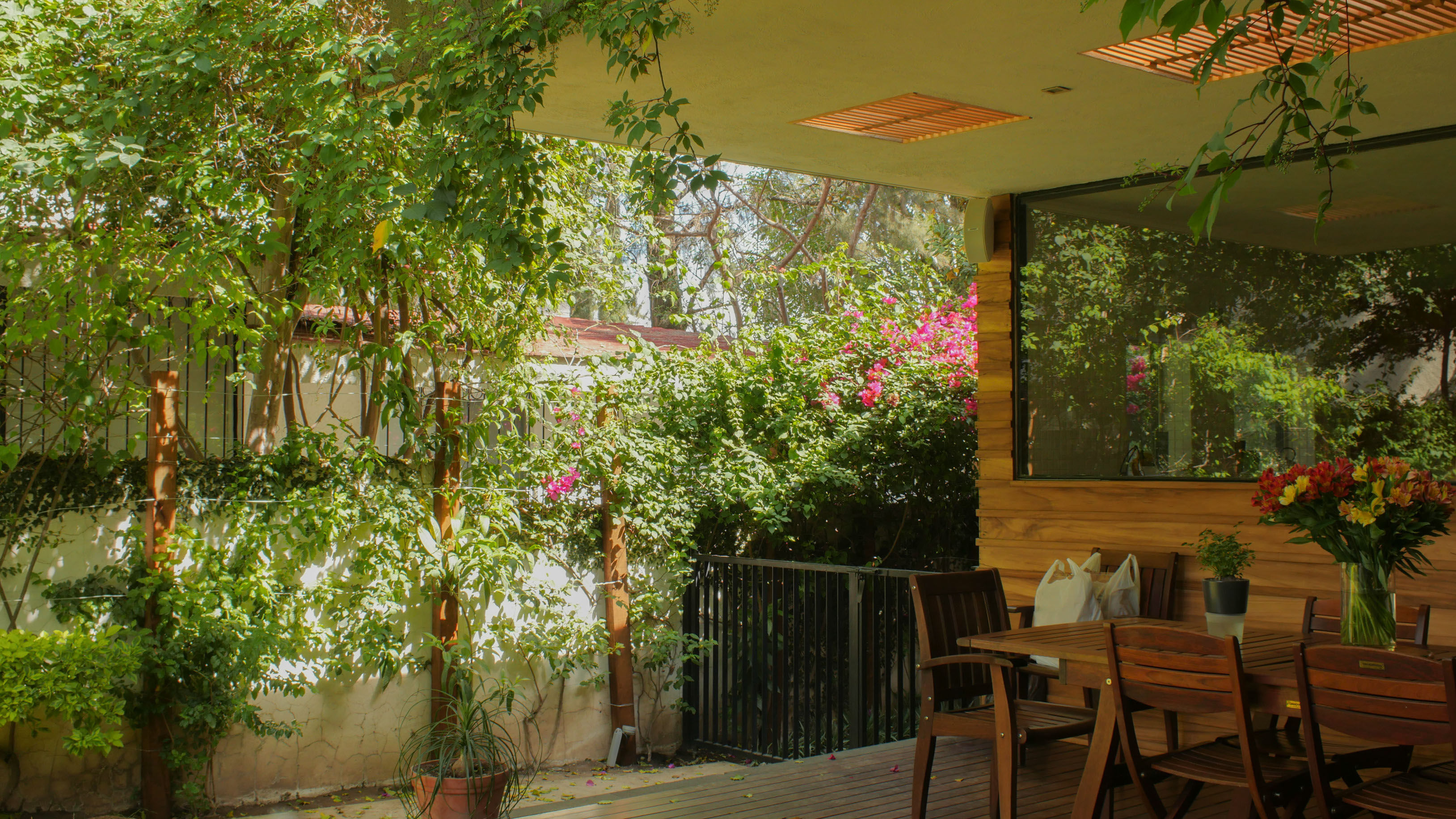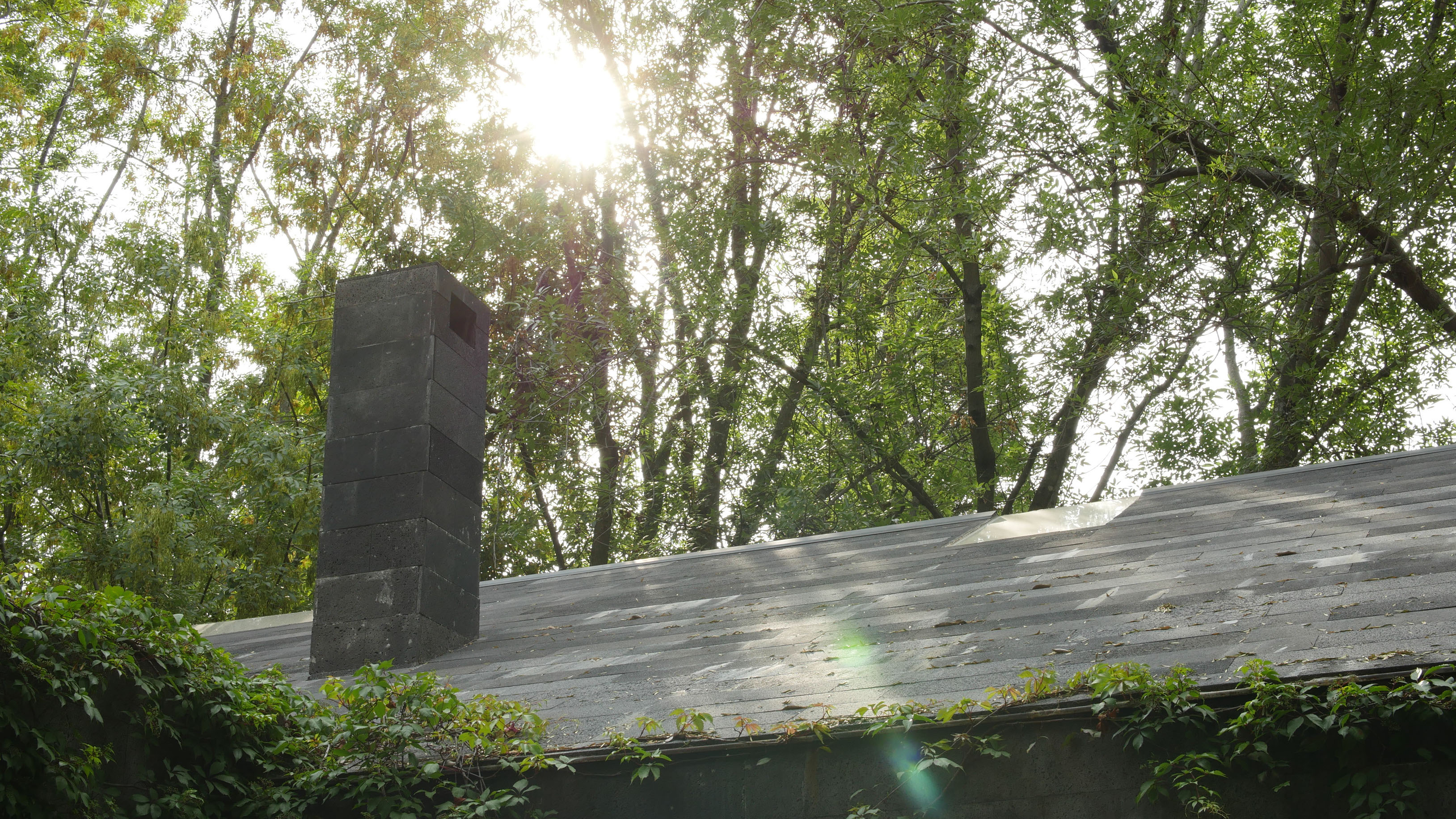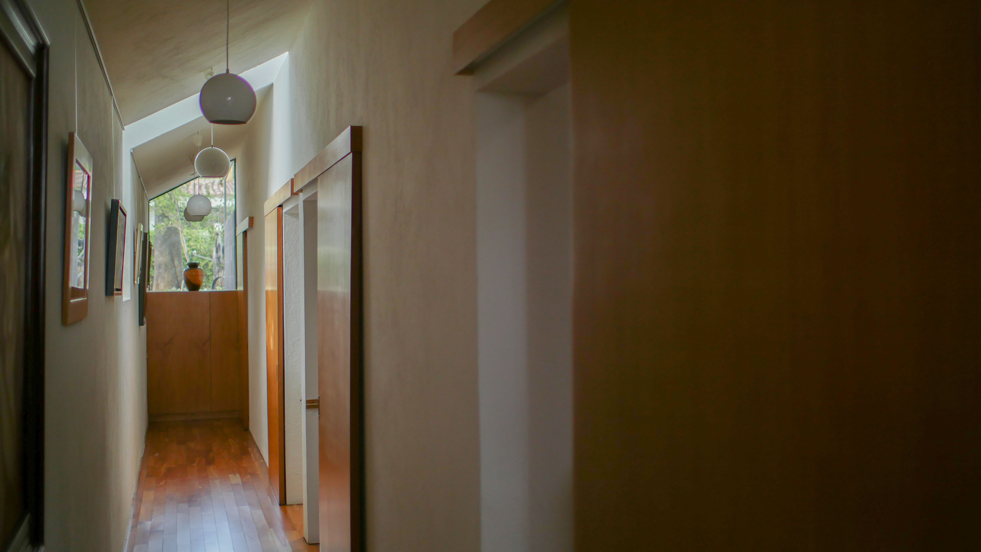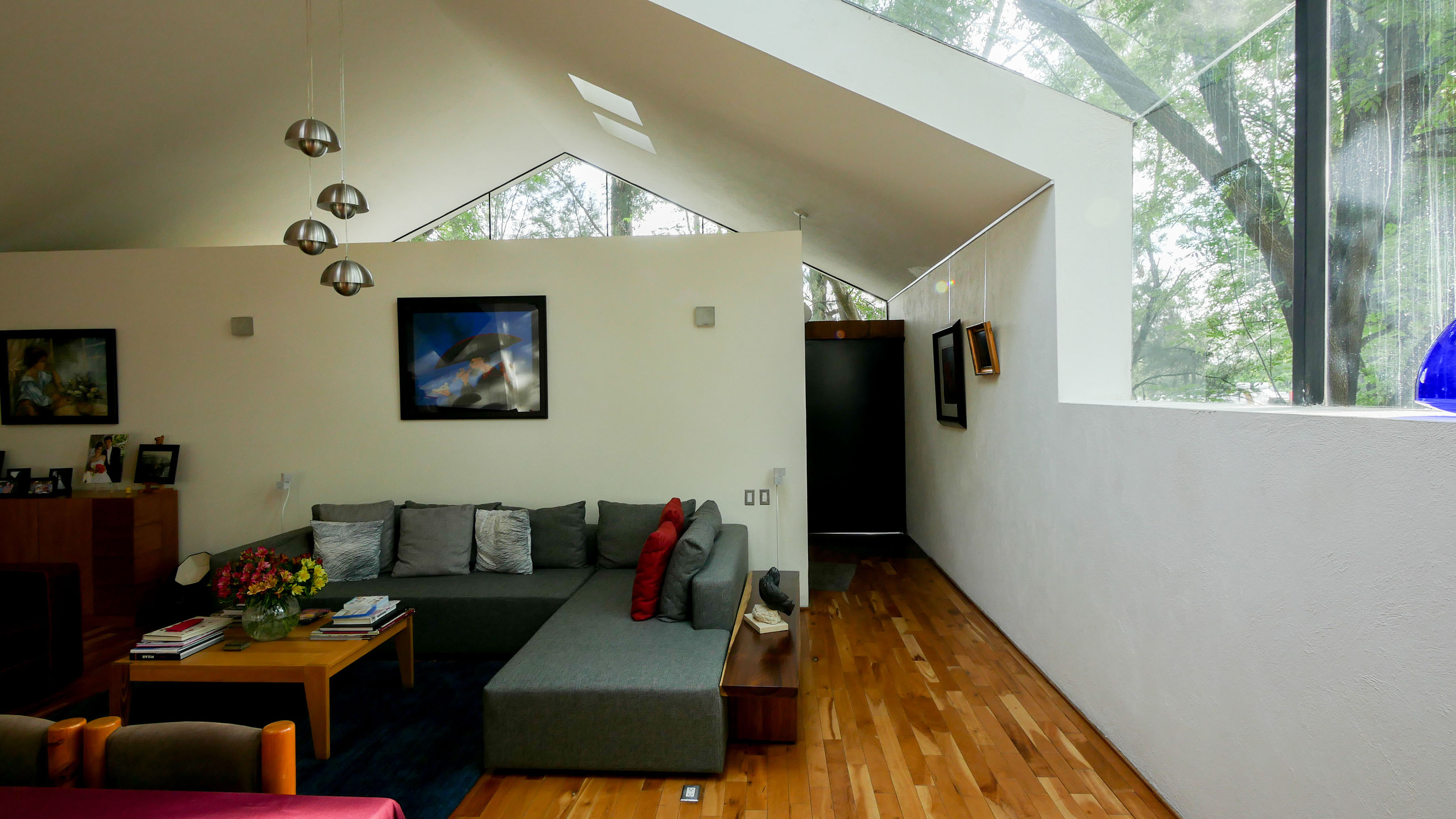 En un terreno rodeado de doce fresnos, el proyecto surge del juego entre las posibilidades de relación con los árboles y una organización programática relativamente sencilla. El edificio se emplaza en forma de “L” sobre el terreno, y a partir de ella se levanta un muro que al plegarse cubre al proyecto de roca volcánica negra, que se perfora para permitir la entrada de luz filtrada por las copas de los árboles. Por una parte, en el exterior este muro genera una fachada poco permeable, mientras que el interior del proyecto se abre totalmente hacia el jardín. El contrapunto del proyecto, una biblioteca y cava, rematan el conjunto con una geometría distinta, donde el lenguaje se invierte, y las fachadas son totalmente transparentes, aquí el libro se convierte en el verdadero resguardo entre el interior y el exterior.